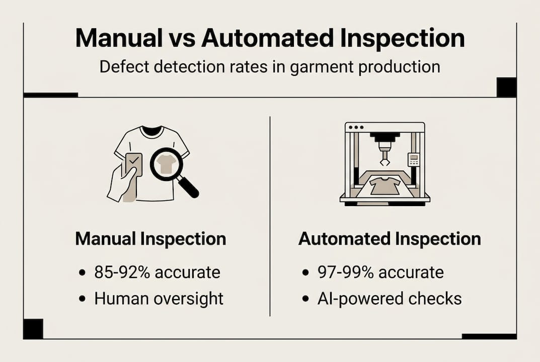 AI-powered vision systems detect defects in real time during production with 97-99% accuracy compared to 85-92% for manual inspection. This technology increases productivity by 173% and reduces cycle time from 35 to 20 minutes per garment. Automation also eliminates human fatigue factors, applies consistent quality standards, and creates digital documentation for every inspection, dramatically reducing rework costs and customer returns.